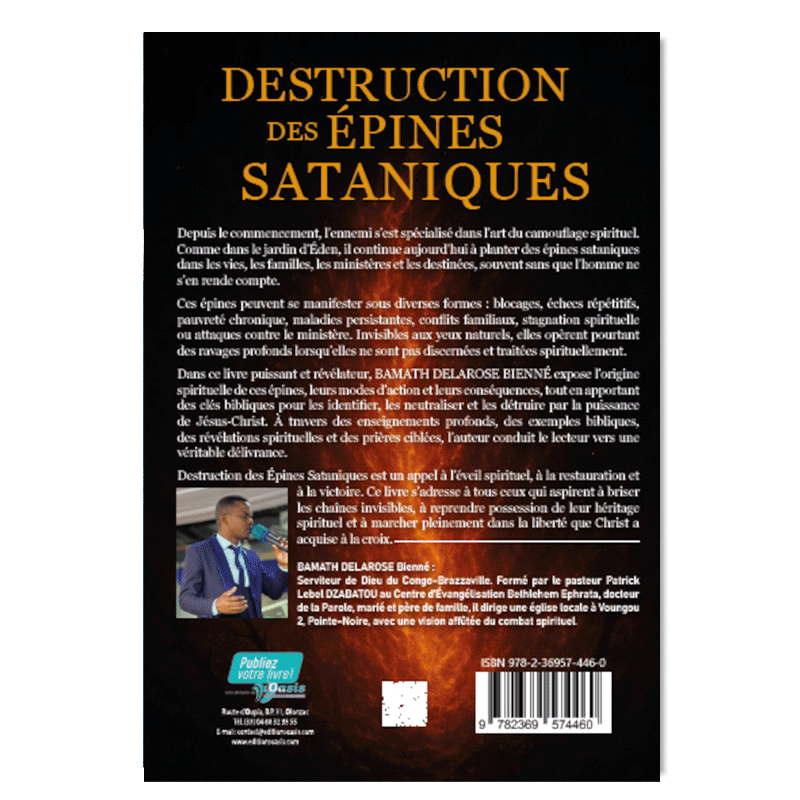 À travers cet ouvrage, Destruction des Épines Sataniques, il conduit le lecteur au cœur des stratégies occultes qui cherchent à blesser, ralentir, étouffer et détourner la vie spirituelle. Il expose les “épines” que l’ennemi plante dans les cœurs, les familles, les ministères et les chemins de destinée — et révèle comment, par la puissance de la Parole et du Saint-Esprit, chaque croyant peut les déraciner.