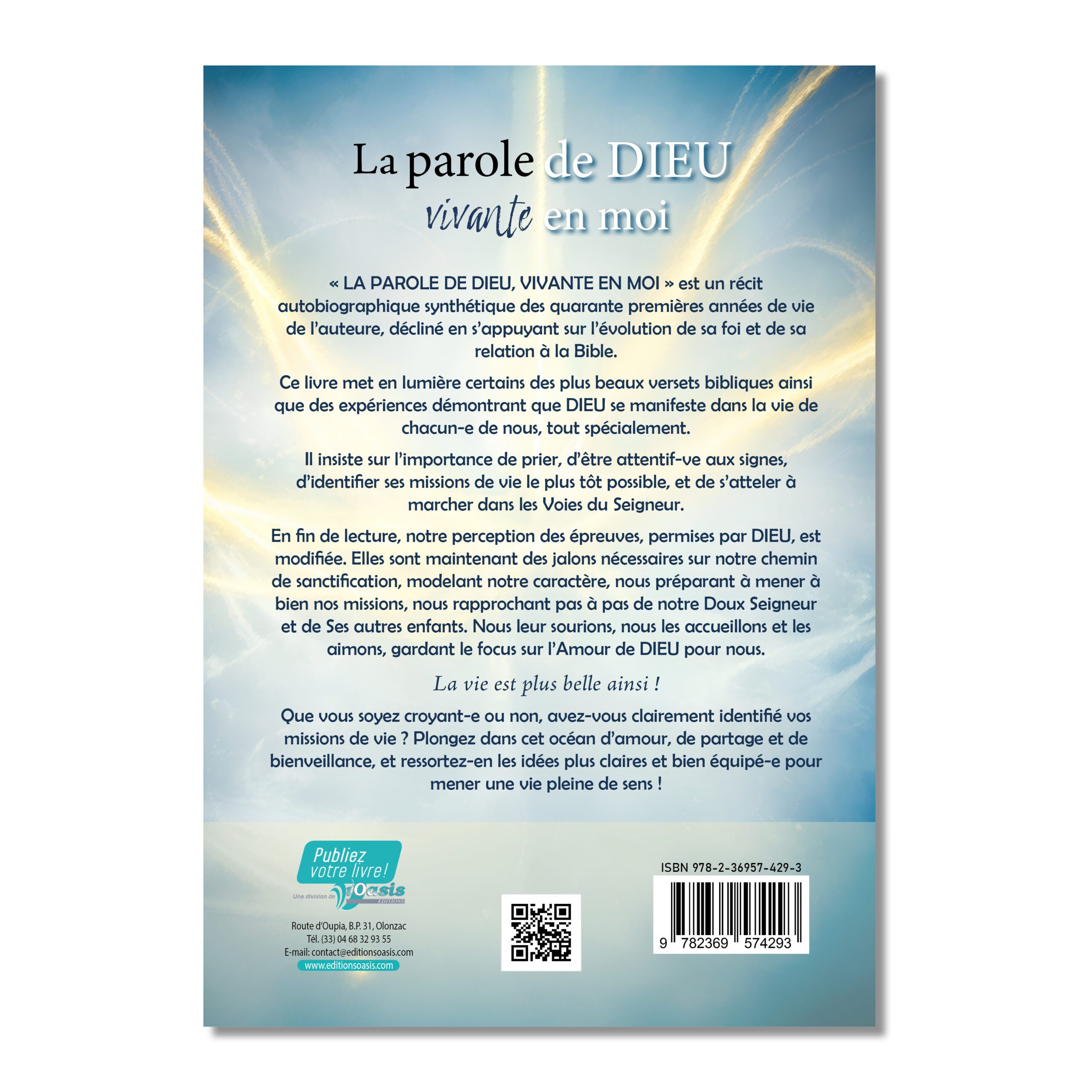 « LA PAROLE DE DIEU, VIVANTE EN MOI » est un récit autobiographique synthétique des quarante premières années de vie de l’auteure, décliné en s’appuyant sur l’évolution de sa foi et de sa relation à la Bible.